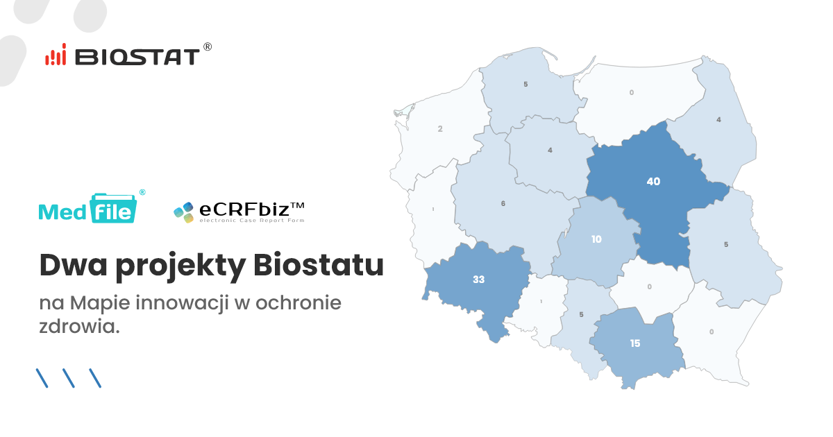 Miło nam poinformować, że nasz projekt eCRF.biz.pl został doceniony przez polskie Ministerstwo Zdrowia. Ministerstwo umieściło informacje o naszym oprogramowaniu na Mapie innowacji w ochronie zdrowia. Mapa ta służy prezentacji innowacyjnych projektów, które przyczyniają się do lepszego funkcjonowania systemu ochrony zdrowia w Polsce. W tej chwili na mapie widnieje ponad 130 innowacji, wśród których są dwie zainicjowane przez Centrum Badawczo-Rozwojowe Biostat® (eCRF.biz.pl oraz Medfile EDM).